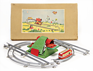 Bergbahn, deutsch, Nachkrieg, Blech lithogr., neuw. im Orig.-Kart., Uhrwerk intakt, teilw. Lagerungsspuren am Tunnel