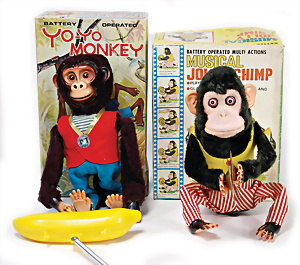 2 Teile, Batterie-Automat, Japan, YO-YO MONKEY, Kunststoff, Batterie-Antrieb, MUSICAL JOLLEY CHIMP, C.K., Batterie-Antrieb, Kunststoff- u. Blechteile, Sitzhöhe 25 cm, neuw. im Orig.-Kart., techn. nicht geprüft