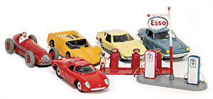 Konv. 5-tlg., Sport- u. Rennwagen, gut - bespielt, dazu 1 Tankstelle LESLY, 1 Tankstelle DINKY TOY, bespielt gut