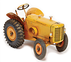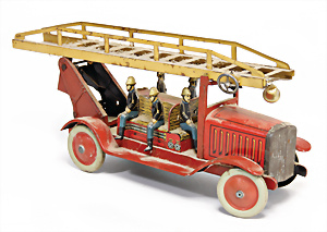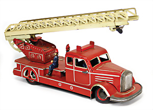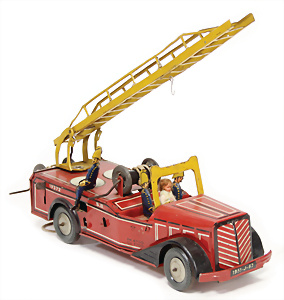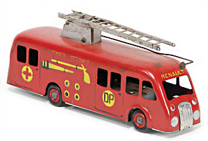 Feuerwehrauto, schwere Blech-Ausführung, Renault, 24 cm, bespielt, Leiter wohl nicht kompl., Uhrwerk defekt