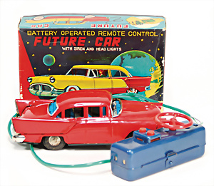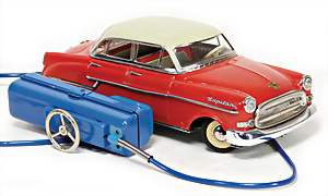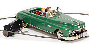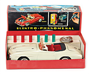 Primat, Cabriolet, mit 2 Fahrerfiguren, Kabelsteuerung, Zahnrad dreht durch, bespielt, guter Zust., 24,5 cm