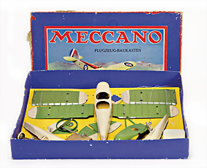 Flugzeug-Baukasten Nr. 10, bespielt, wohl weitgehend kompl., altersbed. Lackfehler, im Orig.-Kart., 2 Seitenlaschen fehlen, 3 Laschen verschlissen