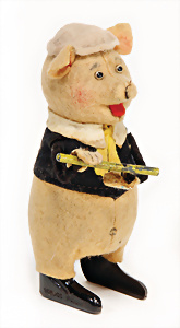 Tanzfigur, Schwein mit Flöte, 11,5 cm, Uhrwerk intakt, Schwanz fehlt, sonst leicht bespielt, guter Zust.