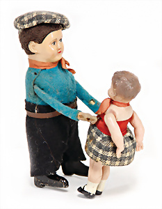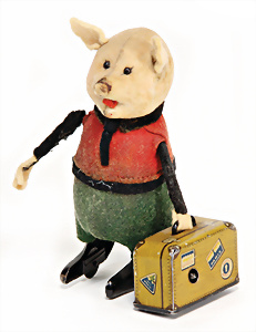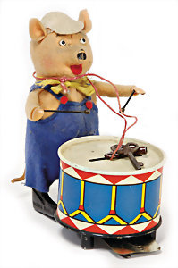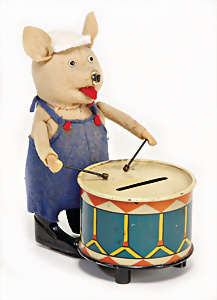 Tanzfigur, Schwein mit Trommel als Spardose, Uhrwerk intakt, guter Zust., Hut möglicherweise ergänzt