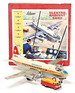 Elektro-Radiant 5600, Swiss-Air, 4-motoriges Propellerflugzeug, Blech lithogr., leicht bespielt, Plexiglas-Scheibe etwas angelaufen, 41 cm, im Kart., Aufschrift „Lufthansa“, dazu 1 Shell-Tankwagen, techn. nicht geprüft, Kart. altersbed. etwas verschlissen
