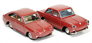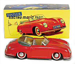Porsche, rot (Porsche 356), 24 cm, 2 kl. Rücklichter fehlen, mit Kabel. bespielt, techn. nicht geprüft, Kart. nicht orig.