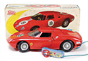 Ferrari, Champion, Rennwagen, Kunststoff, 40 cm, Kabelsteuerung, bespielt, gut, techn. nicht geprüft, im Orig.-Kart., Tankdeckel orig.?,