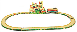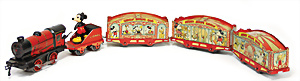 Mickey Mouse, Walt Disney Production, Stoker, Schlepptender-Lok B, 3 lithogr. Wagen, Circus Dining Car, Mickey Mouse Circus, Mickey Mouse Band, Made in US of America, 1 Kupplung ergänzt, insgesamt schöner, leicht bespielter Orig.-Zust., selten