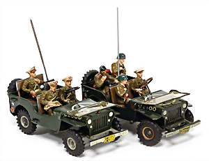2 Teile, Jeep, untersch. Lithographie-Varianten, darunter 1x Military Police, Rücklehne an hinterer Sitzbank geklebt, Uhrwerk intakt, 1x Rücklehne hinten weggebrochen, Uhrwerk intakt, mit Figuren, leicht bespielt gut