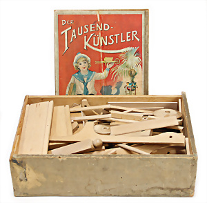 Holzbaukasten, „Der Tausend-Künstler“, Orig.-Holzkiste, mit bunt lithogr. Deckbild, mittig geklebt, auf Vollständigkeit nicht geprüft, ohne Anleitung, um 1900