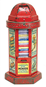 Schokoladen-Automat, „Chocolate-Menier“, Blech lithogr.,25 cm, bespielt, Lackfehler oben und am Sockel, lithogr., gut
