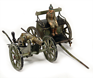Gespann mit Kanone, altes MÄRKLIN Zeichen, Blech, handlackiert, mit 1 Figur, ohne Pferde, Durchm. der Räder 5,5 cm, bespielt, gut