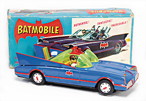 Batmobil, Japan, Blech, 29 cm, Batterie-Antrieb, neuw. im Orig.-Kart., kl. Druckstelle auf der Motorhaube