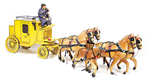 Postkutsche, Holz, farbig gefasst, L: 60 cm, H: 27 cm, 4 Zugpferde, 1 kl. Pferd, mit Kutscher, schöner Orig.-Zust.