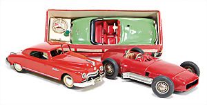 Konv. Blechspielzeug, Nachkrieg, ARNOLD Format, Fuhrwerk intakt, 1 Rücklicht sowie 1 Radkappe fehlen, daher 1 Rad lose, 1 SCHUCO 2095, Mercedes 190 SL, stärker bespielt, Frontscheibe weggebrochen, im Orig.-Kart., JNF Monoposto, Rennwagen, Friktionsantrieb, bespielt, 24 cm