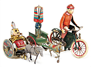 3 Teile Blech, LEHMANN, Clown mit Esel, Spiralfederwerk intakt, bespielt, gut, Ohren am Esel fehlen, 1 Wagen, Figur mit Flügelrad, bespielt, Uhrwerk defekt, 1 Fahrrad Fahrer HALLOH, 19 cm, nicht signiert, bespielt, Uhrwerk intakt