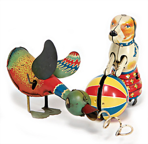 2 Teile Blech lithogr., Hund mit Ball, 11,5 cm, guter Zust., 1 Ente, Made in France, 19 cm, guter Zust., Uhrwerk intakt