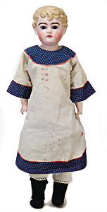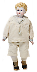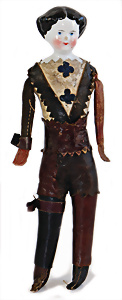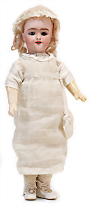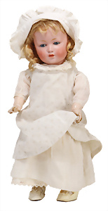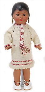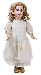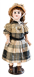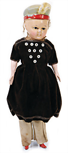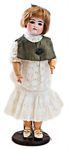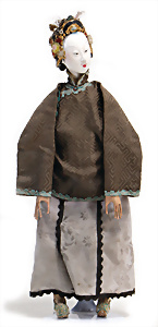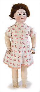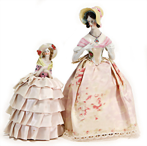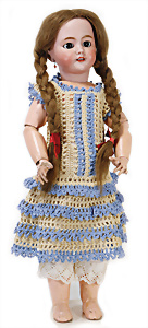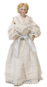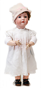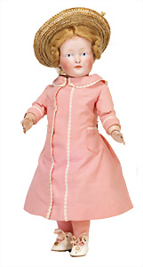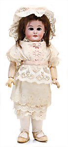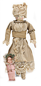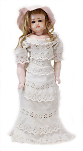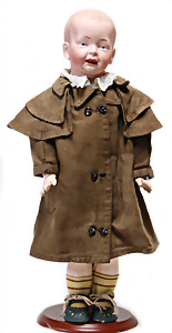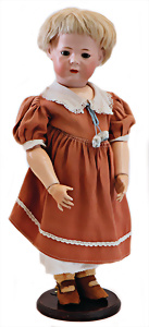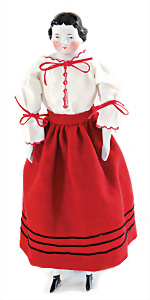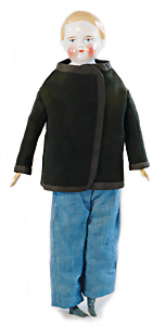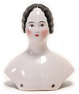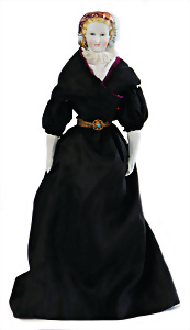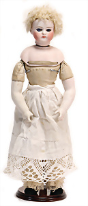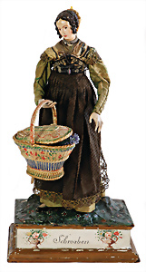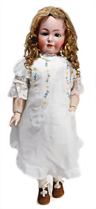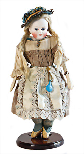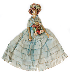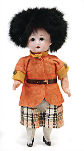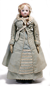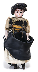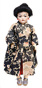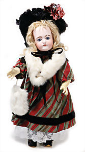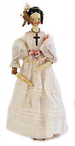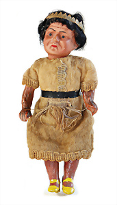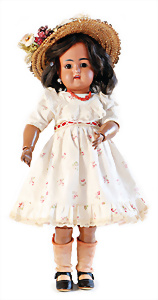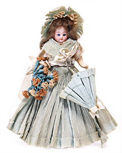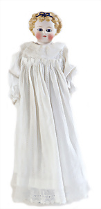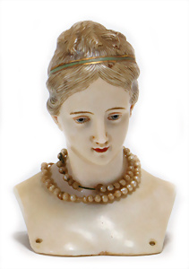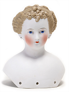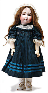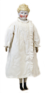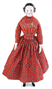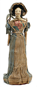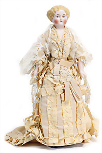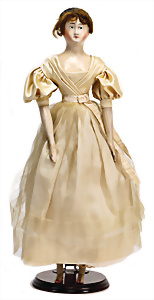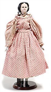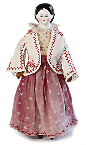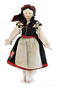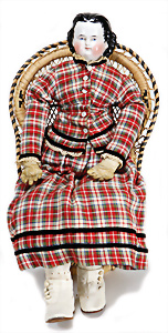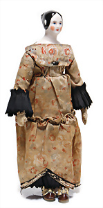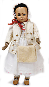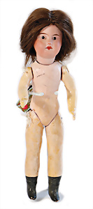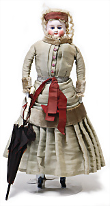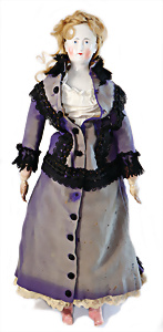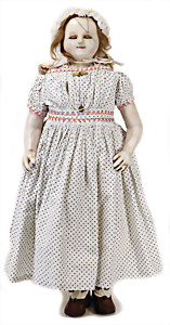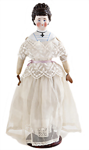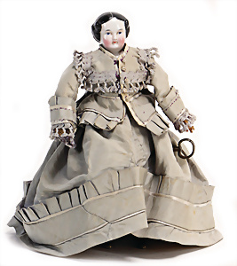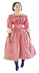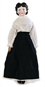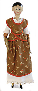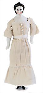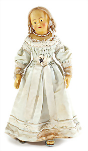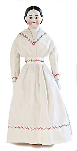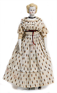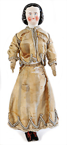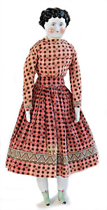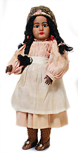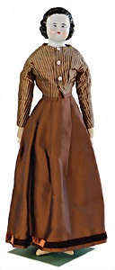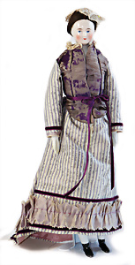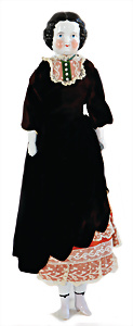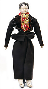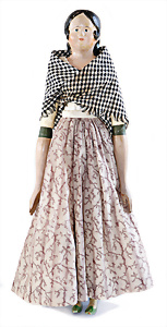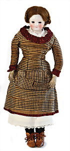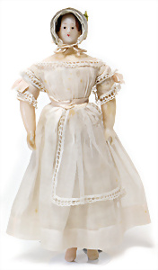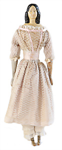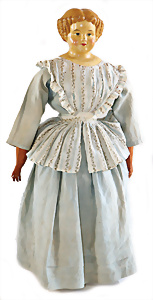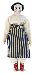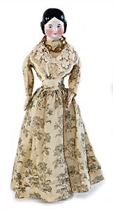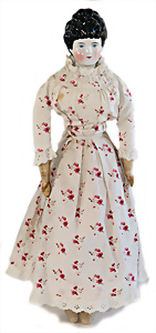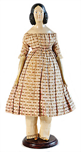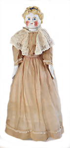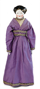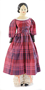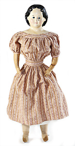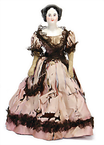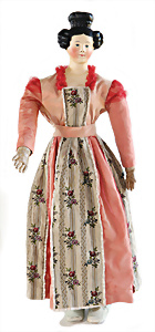 Adelaide, Papiermaché-Puppe, um 1830, Thüringen, Brustblattkopf, tiefes, eckiges, gerades Brustblatt, stark ausmodell. Busen, leichter Ohrenansatz, altersbed. Rissbildung auf der Rückseite, ausgefallen, ausmodell. Hochsteckfrisur, blaue gemalte Augen, durchst. Nasenlöcher, feine gemalte Mundpartie, linke Gesichtshälfte sowie Stirn farbl. etwas überarbeitet, schwarze, bemalte, sehr stark ausgeprägte und detailliert modell. Biedermeier-Frisur, im so genannten Adelaide-Stil, nach der Ehefrau von König William (1820-1837) von England, mit Flachs gestopfter Leinenkörper, schlanke Taille, breite Hüftpartie, massige Oberarme, Hände u. Teile der Arme aus Guttapercha, sehr schöne kunstvoll genähte Hände, mit einzeln abgenähten Fingern, 77,5 cm, alte Schuhe, Kleid neuer, alte Unterkleidung
