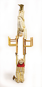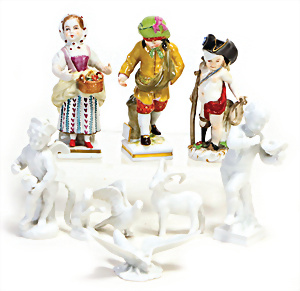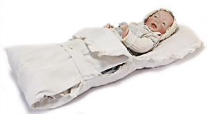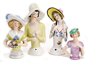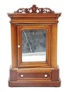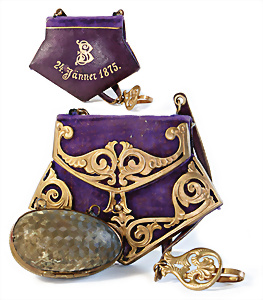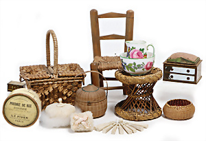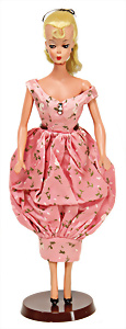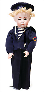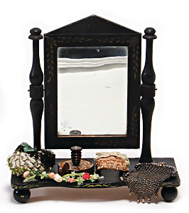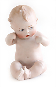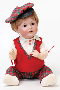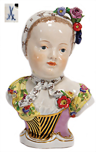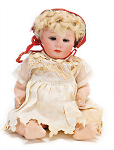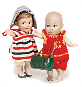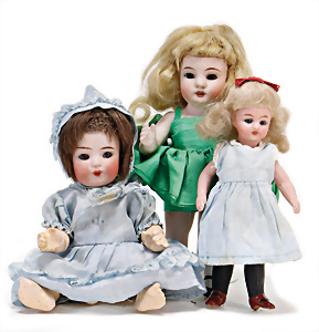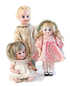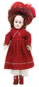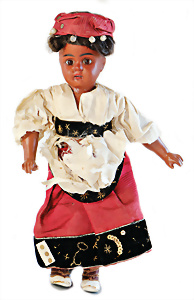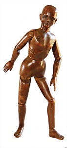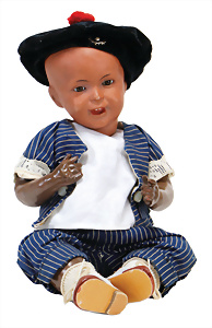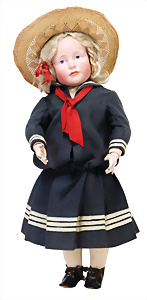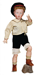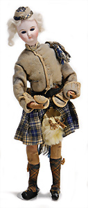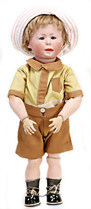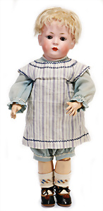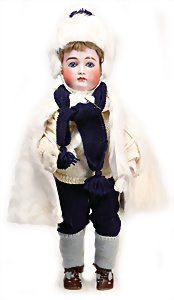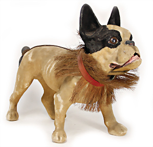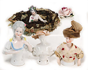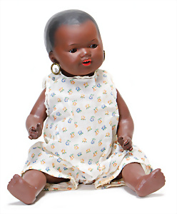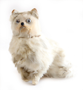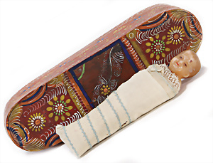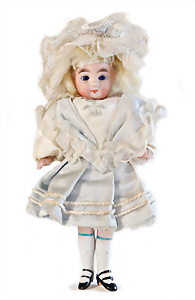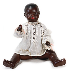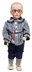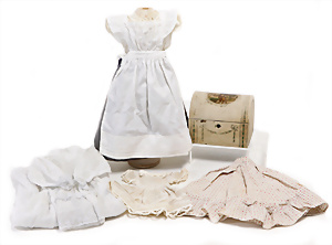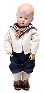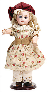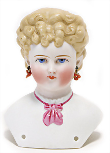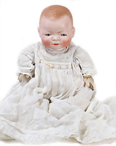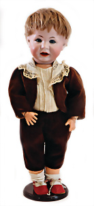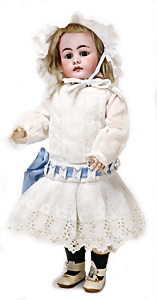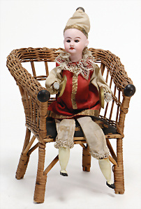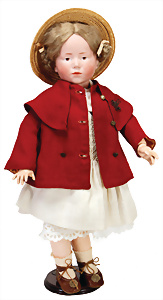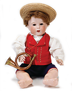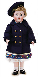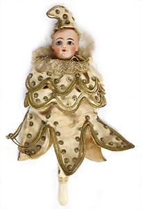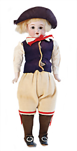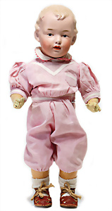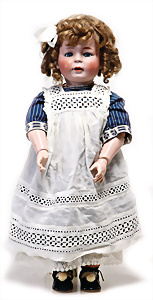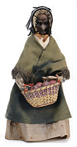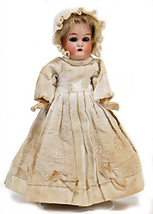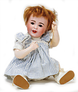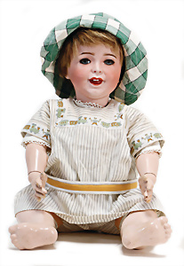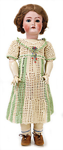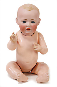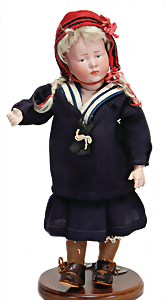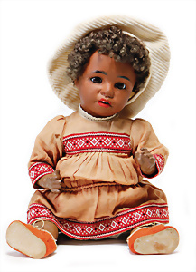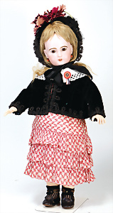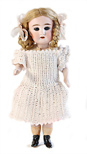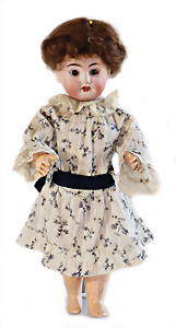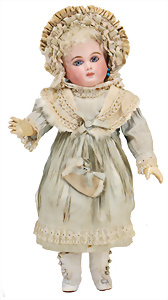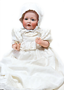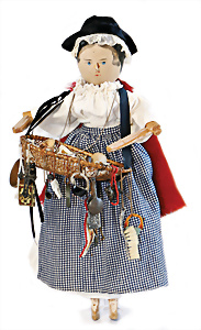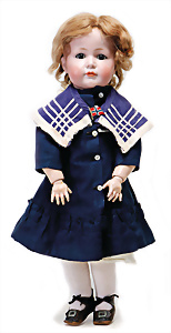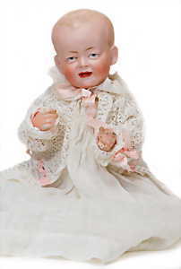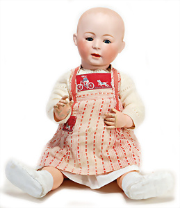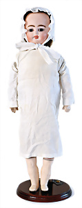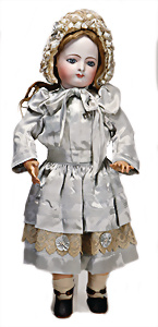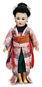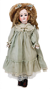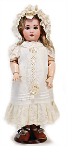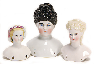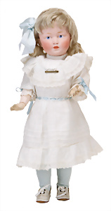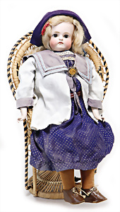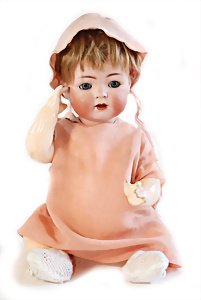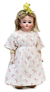 Adelaide, Papiermaché-Puppe, um 1830, Thüringen, Brustblattkopf, tiefes, eckiges, gerades Brustblatt, stark ausmodell. Busen, leichter Ohrenansatz, altersbed. Rissbildung auf der Rückseite, ausgefallen, ausmodell. Hochsteckfrisur, blaue gemalte Augen, durchst. Nasenlöcher, feine gemalte Mundpartie, linke Gesichtshälfte sowie Stirn farbl. etwas überarbeitet, schwarze, bemalte, sehr stark ausgeprägte und detailliert modell. Biedermeier-Frisur, im so genannten Adelaide-Stil, nach der Ehefrau von König William (1820-1837) von England, mit Flachs gestopfter Leinenkörper, schlanke Taille, breite Hüftpartie, massige Oberarme, Hände u. Teile der Arme aus Guttapercha, sehr schöne kunstvoll genähte Hände, mit einzeln abgenähten Fingern, 77,5 cm, alte Schuhe, Kleid neuer, alte Unterkleidung