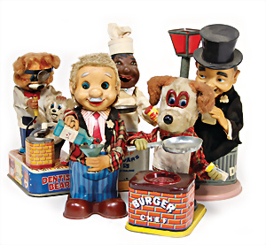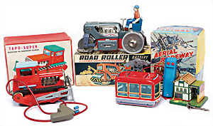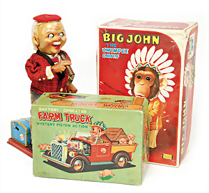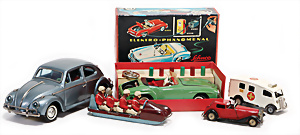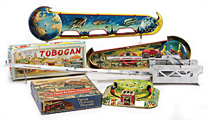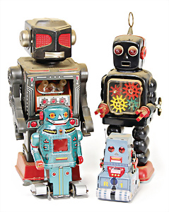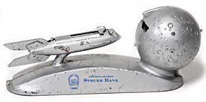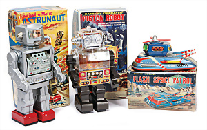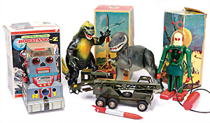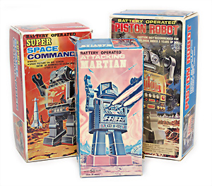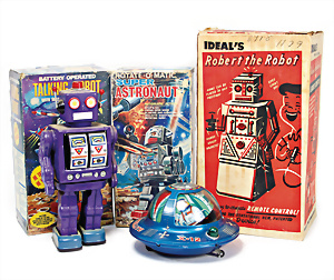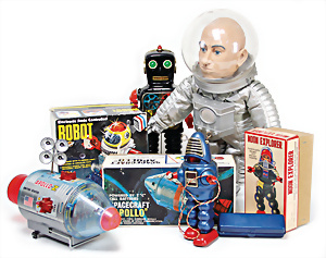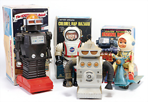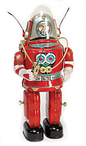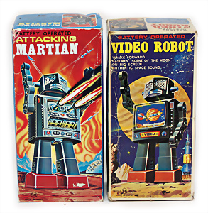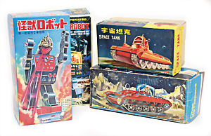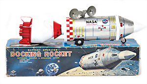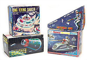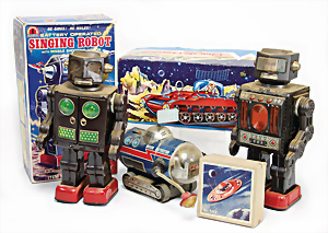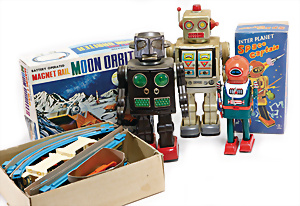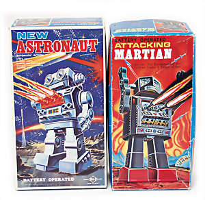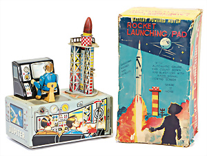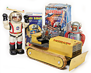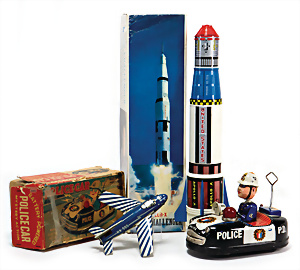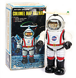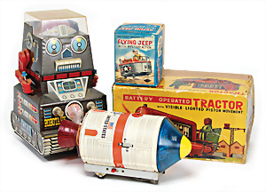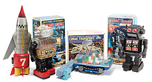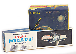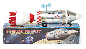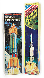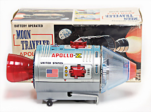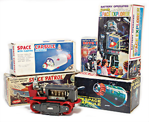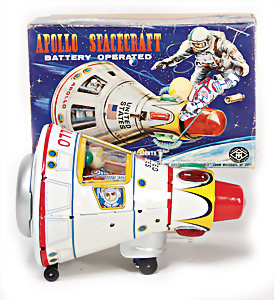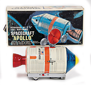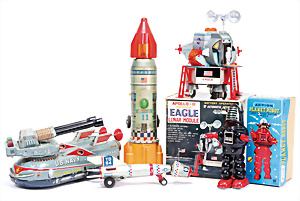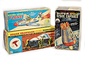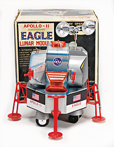 Apollo II, American Eagle, Lunar Module, Batterie-Antrieb, Blech, Japan, kl. Ecke an der Antenne weggebrochen sonst guter Zust., im Orig.-Kart., 1 Rakete mit Kapsel, Friktionsantrieb bespielt, Action Planet Robot, Uhrwerk-Antrieb, 21 cm, Japan, neuw. im Orig.-Kart., Planet Robot-Leerkart., Wind-Up Mechanismus, neuere Produktion, Apollo Rakete, Japan, Blech- u. Kunststoffteile, bespielt, Antriebsteil hinten lose, Space-Tank, Blech, Batterie-Antrieb, Japan, 35 cm, bespielt, kl. Kunststoffteil hinten gebrochen