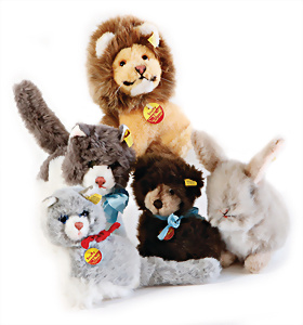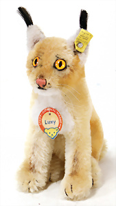 Katze, Lizzy, mit Knopf, Schild und Fahne, Aritkel Nummer: 2713/15, Stehhöhe 16 cm, Länge 17 cm, neuw. Zust.