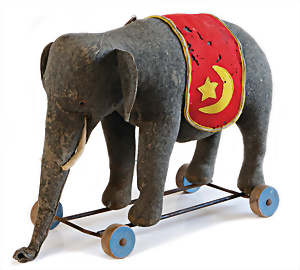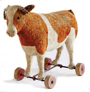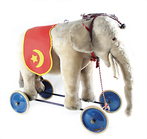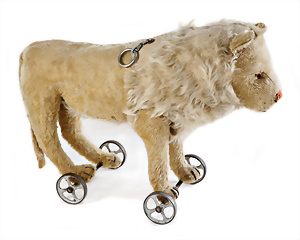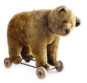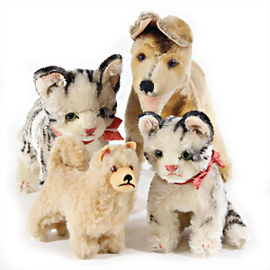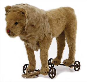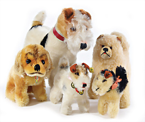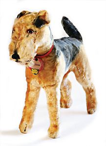 wohl Steiff, Hund, Typ Irisch Terrier, grau / braun, an vereinzelten Stellen etwas Mohairverlust, Schuhknopfaugen, Vorderpfoten auf Steiff typischen Gussspeichenrädern, Hinterbeine auf Metallräden, wohl nicht orig., Höhe 34cm, Länge 39cm, hochwertig verarbeitet