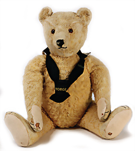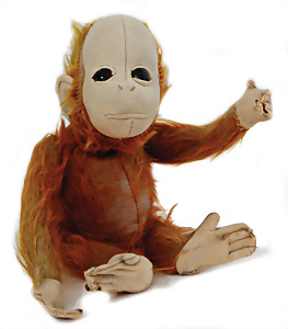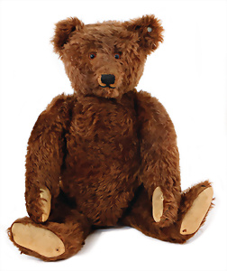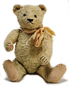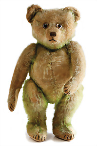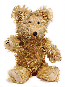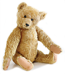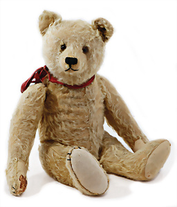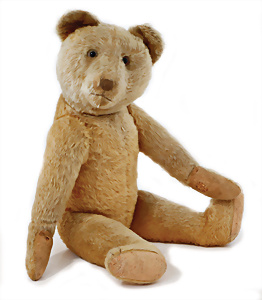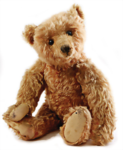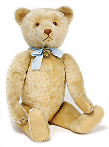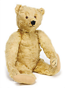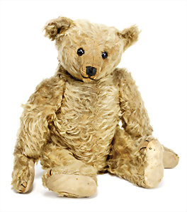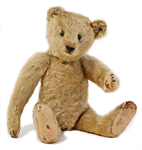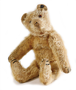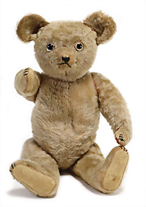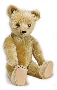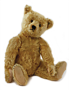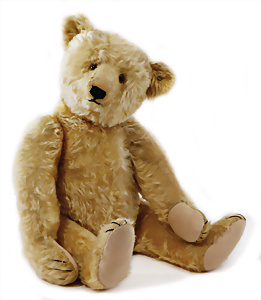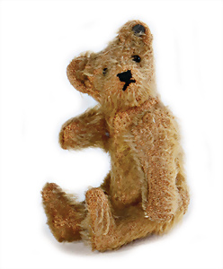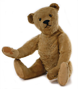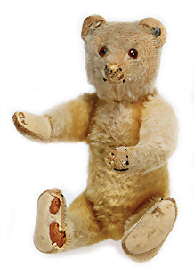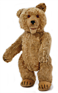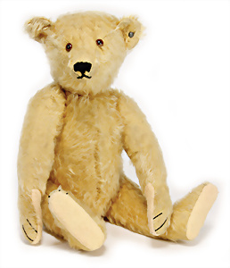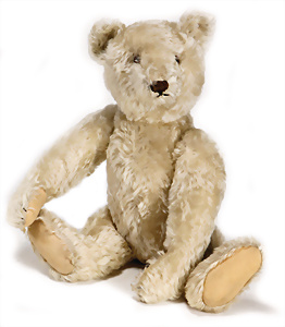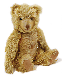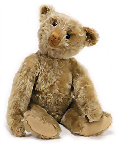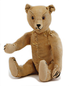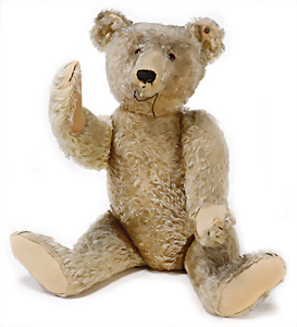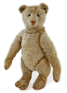 Bär, Vorkrieg, ca. 1930, mit Knopf, langgezogenes f, Glasaugen, maisfarbend, Buckel, lange abgeknickte Arme, an kl. Stellen Mohaiverlust, eingestaubt, Filztatzen teilw. etwas löchrig, 30 cm, schöner Ausdruck