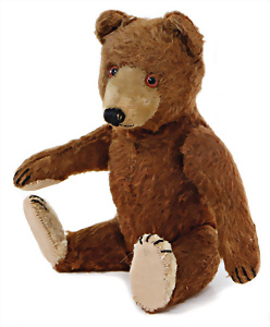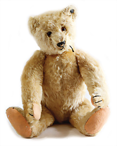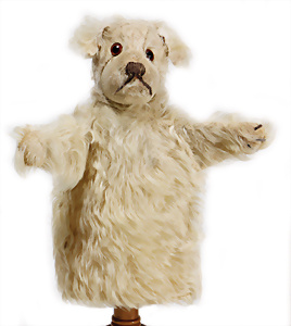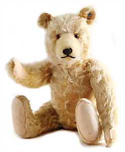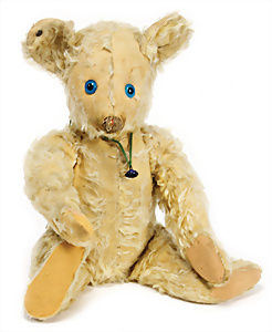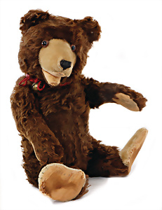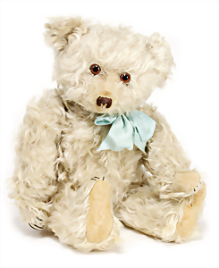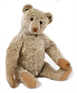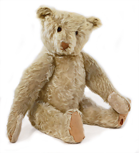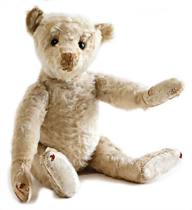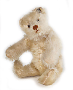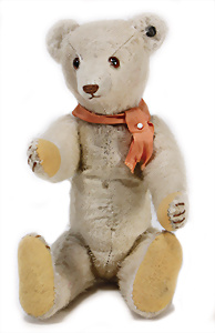 Bär, Vorkrieg, ca. 1925, mit Knopf, langgezogenes f, Glasaugen, helle Nasenbestickung, weißes Mohair, teilw. ausgegangen, Buckel, lange abgeknickte Arme, Filztatzen an vereinzelten Stellen etwas löchrig, an der rechten Filztatze Flicknähte, 50 cm, sehr schöner Ausdruck besp.