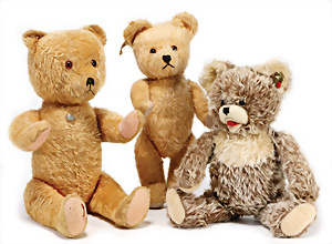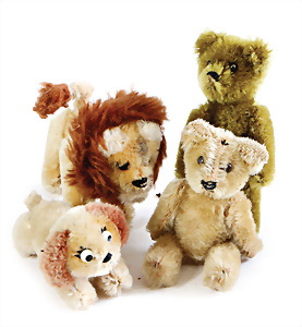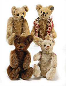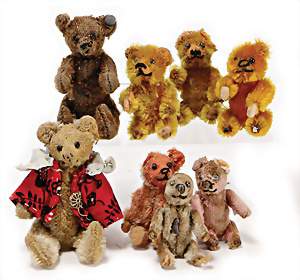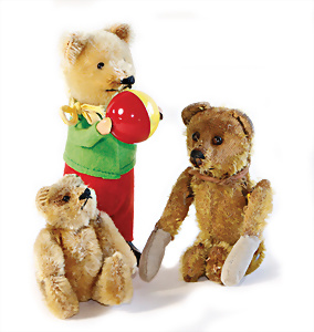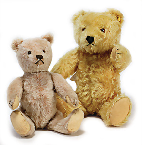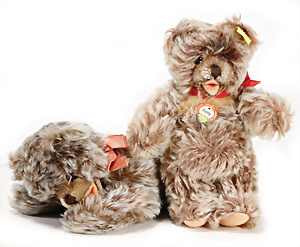 Bär, Vorkrieg, mit Knopf, langgezogenes f, ca. 1935, mit Glasaugen, helle Nasenbestickung, 13 cm, teilw. Mohairverlust, etwas eingestaubt, dazu kl. Bär, Vorkrieg, 9 cm, Schuhknopfaugen, Buckel, schöner Ausdruck