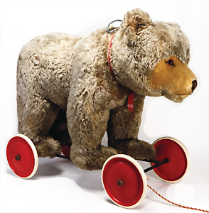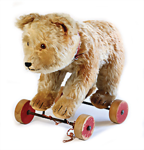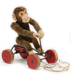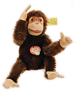 Molly, hergestellt zwischen 1929-1935, mit Knopf, lang gezogenem F, rote Fahne, Artikel Nummer: 1328,2, auf Holzrädern, 28 cm, Langmohair, braun gespitzt, stehend, knopf drehbar, kl. am linken Auge Mohairverlust