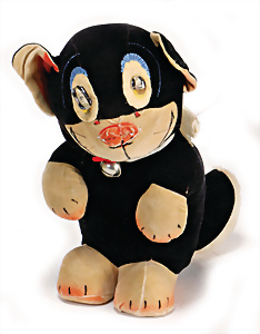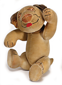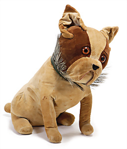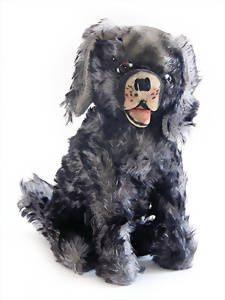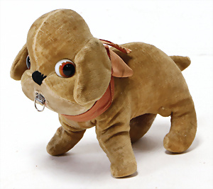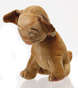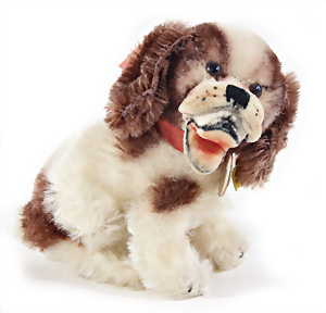 Arco, Hund, 50er Jahre, mit Knopf, Schild und Fahne, Artikel Nummer: 1310,0, Brustschild etwas ausgeblichen, an einer Stelle etwas verschlissen, Länge 13 cm, Schnautze mit Samteinsatz, schöner Verlauf; schöner Ausdruck