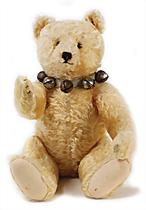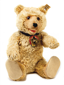 Bär, Vorkrieg, ca. 1930, mit Knopf, langgezogenes f, ca. 48 cm, Glasaugen, lange abgeknickte Arme, Buckel, altes Lederhalsband mit Glocke, Mohair gelb / gold, eingestaubt, teilw. Moahirverlust, Filztatzen bis auf kl. Stellen guter Zust. schöner Ausdruck