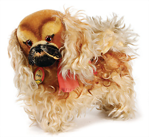 Hund, Salyham, Kunstseidenplüsch, mit blankem Knopf, drehbarer Kopf, etwas vergilbt, Länge 23 cm, Höhe 13 cm, teilw. etwas besp.