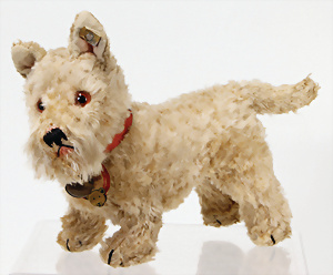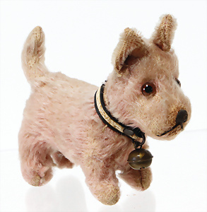 Scotty, Hund, Vorkrieg, mit Knopf, langgezogenes f, minimale Reste der roten Fahne, mit Brustschild, hergestellt zwischen 1931-1933, Höhe 18 cm, Glasaugen, Halsband mit Glocke, volles Mohair