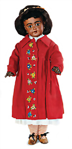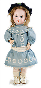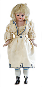 Belton-Typ,Biskuit-Porzellan-Vollkopf, blaue fest eingesetzte Paperweight-Augen, geschl. Mund, Nackenmarkierung: 117, Masse, Stehkörper, bewegl. Arme u. Beine, 24 cm, Kleid neuer