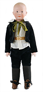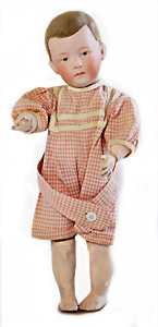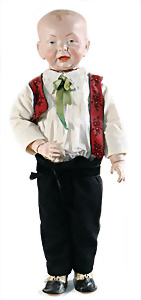 Biskuit-Porzellan-Kurbelkopf, Charakter, blaue gemalte Intaglio-Augen, off./geschl. Mund, leichte angesetzte Zunge, Nackenmarkierung 536/4, Haarriss an der Schläfe, sowie geklebter Ausbruch am Hinterkopf, Kurbel restauriert, Mohair-Perücke, Gliederkörper in gutem Zust., feste Handgelenke, 34 cm