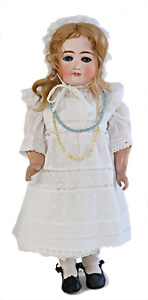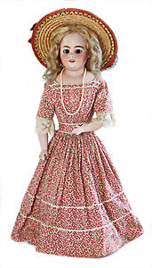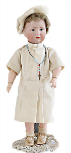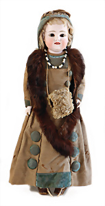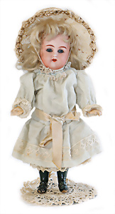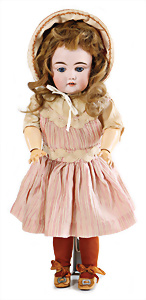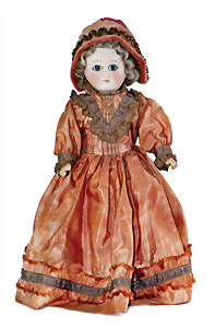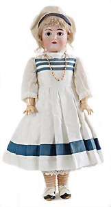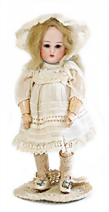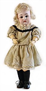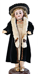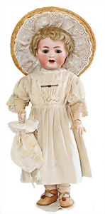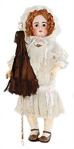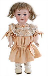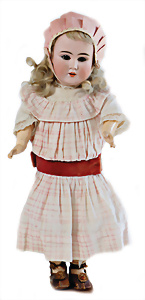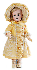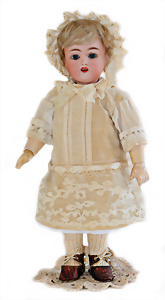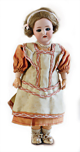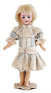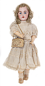 Biskuit-Porzellan-Brustblattkopf, gem. 7½, blaue fest eingesetzte Schlafaugen, geschl. Mund, orig. Gipsdecke wurde nicht entfernt, bitte Transportrisiko beachten, abgenähter Lederkörper, Biskuit-Unterarme, 42 cm, von außen keine Risse zu erkennen, alte Kleidung, alte Unterkleidung, alte Echthaar-Perücke
