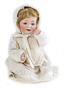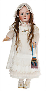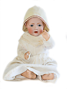 Biskuit-Porzellan-Kurbelkopf, Nackenmarkierung: Made in Germany DEP 156, blaue Schlafaugen, off. Mund, oben Zahnreihe, fest aufgeklebter Gipsdeckel, Transportrisiko für Augenmechanismus beachten, von außen keine Risse zu erkennen, Gliederkörper, 69 cm, Körper bis auf wenige Stellen in gutem Zust., altes Kleid, alte Haube, alte Mohair-Perücke, etwas verstaubt, sonst schön