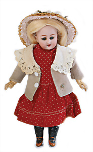 Biskuit-Porzellan-Brustblattkopf-Puppe, Nackenmarkierung: schwach, braune Schlafaugen, off. Mund, oben Zahnreihe, Biskuit-Unterarme, 28 cm, alte blonde Echthaar-Perücke, vereinzelt etwas ausgegangen, Kleid neuer, schöner, alter Hut