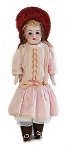 Biskuit-Porzellan-Kurbelkopf auf Biskuit-Porzellan-Brustblatt, Nackenmarkierung: 300, braune Schlafaugen, off. Mund, oben Zahnreihe, durchst. Ohren, fest aufgeklebte Perücke, Transportrisiko für Augenmechanismus beachten, Gliederkörper mit Masse-Arme u. -Beine, Alter ?, Kleide neuer, 52 cm