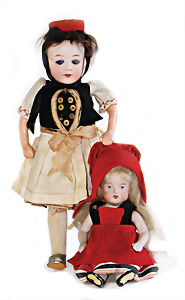 Ganzbiskuit-Mädchen, blaue gemalte Augen, off. Mund, oben Zahnreihe, Biskuit-Unterarme u. -Beine, bewegl., ausmodell. Schuhe u. Strümpfe, 15 cm, dazu 1x Biskuit-Porzellan-Kurbelkopf wohl HEUBACH, blaue Schlafaugen, geschl. Mund, einfacher Masse-Körper, bewegl. Arme u. Beine, Trachtenkleidung, 21 cm, ein Schuh fehlt