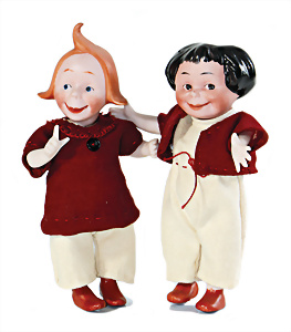 Max & Moritz, Ganzbiskuit, ausmodell. Frisur, seitl. blickende gemalte Augen, Melonen-Mund, Biskuit-Arme u. -Beine, sowie Drehkopf, 14 cm