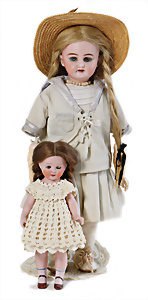 2 Teile, 1x Ganzbiskuit-Puppe, gem. Made in Germany, off./geschl. Mund, Biskuit-Arme u. -Beine, bewegl., ausmodell. Schuhe u. Strümpfe, 17 cm, Mohair-Perücke, dazu 1x Biskuit-Porzellan-Brustblattkopf, blaue Schlafaugen, off. Mund, oben Zahnreihe, durchst. Ohren, auf Hinterkopf Nackenmarkierung: roter Stempel, Wimpern, gesetzt und geschützt, Masse-Gliederkörper mit festen Handgelenken, Gummis etwas lose, 31 cm, Echthaar-Perücke