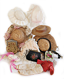 Konv. Hüte, ca. Durchm. 9 cm, Stroh geflochten, sowie ein paar Kleidungsstücke und 3x Taschen Perlenarbeit, schönes Konv.