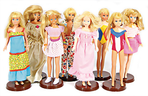 5 Puppen, 2x Julia,1x Riss am Hals u. Verfärbung an den Ohrlöchern, 3x Swirl Ponytail-Barbie, Straight-Leg, blond, stärker bespielt, Verfärbungen an den Ohren, bzw. Einrissstellen an den Köpfen, Orig.-Outfits nicht kompl.