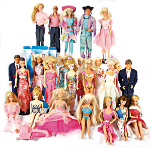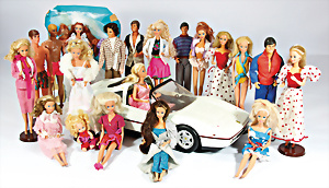Konv. 80er/90er Jahre Barbies u. Ken, alle bespielt, dazu 1 Ferrari, weiß, bespielt, gem. 1986.