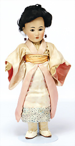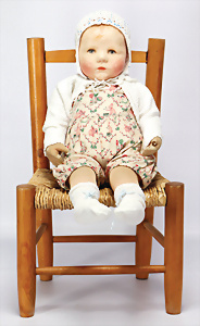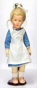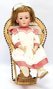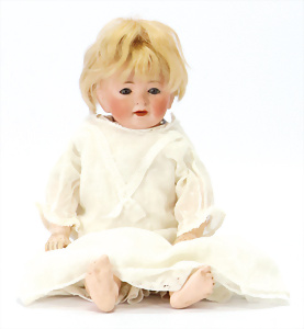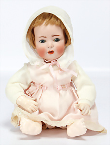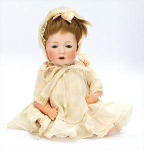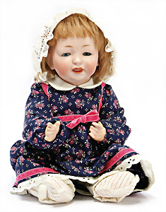 K&R 117N, 70 cm, braune Schlafaugen, off. Mund, oben Zähne, normaler Gliederkörper, Perücke später