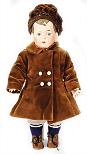 Porzellan-Vollkopf-Junge, ungem. Haare beflockt, blaue fest eingesetzte Glasaugen, geschl. Mund, auf Masse-Toddler-Körper, 2 Finger ergänzt, 35 cm, Kleidung nachgenäht