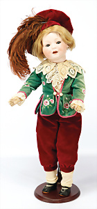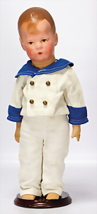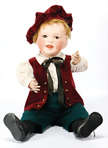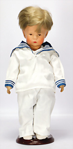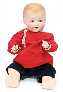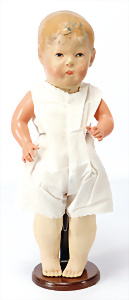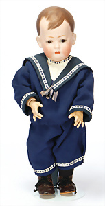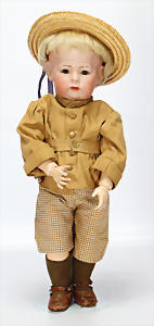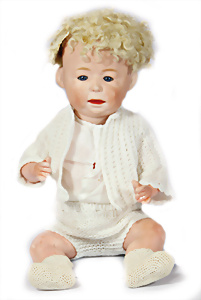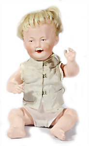 Charakter-Junge, gem. 1 Germany 7768, modell. Frisur, Kopf Porzellan oben off., aufgeklebte Mohair-Perücke, gemalte Augen, off. Mund, auf Masse-Sitzbaby-Körper mit leicht abstehendem Zeh, 23 cm