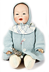 Porzellan-Charakter-Baby, gem. Germany 3, blaue Schlafaugen, off./geschl. Mund, Fell-Perücke auf Masse-Sitzbaby-Körper, Unterarme nachmodell., Einrissstelle an rechter Kniekehle, 25 cm